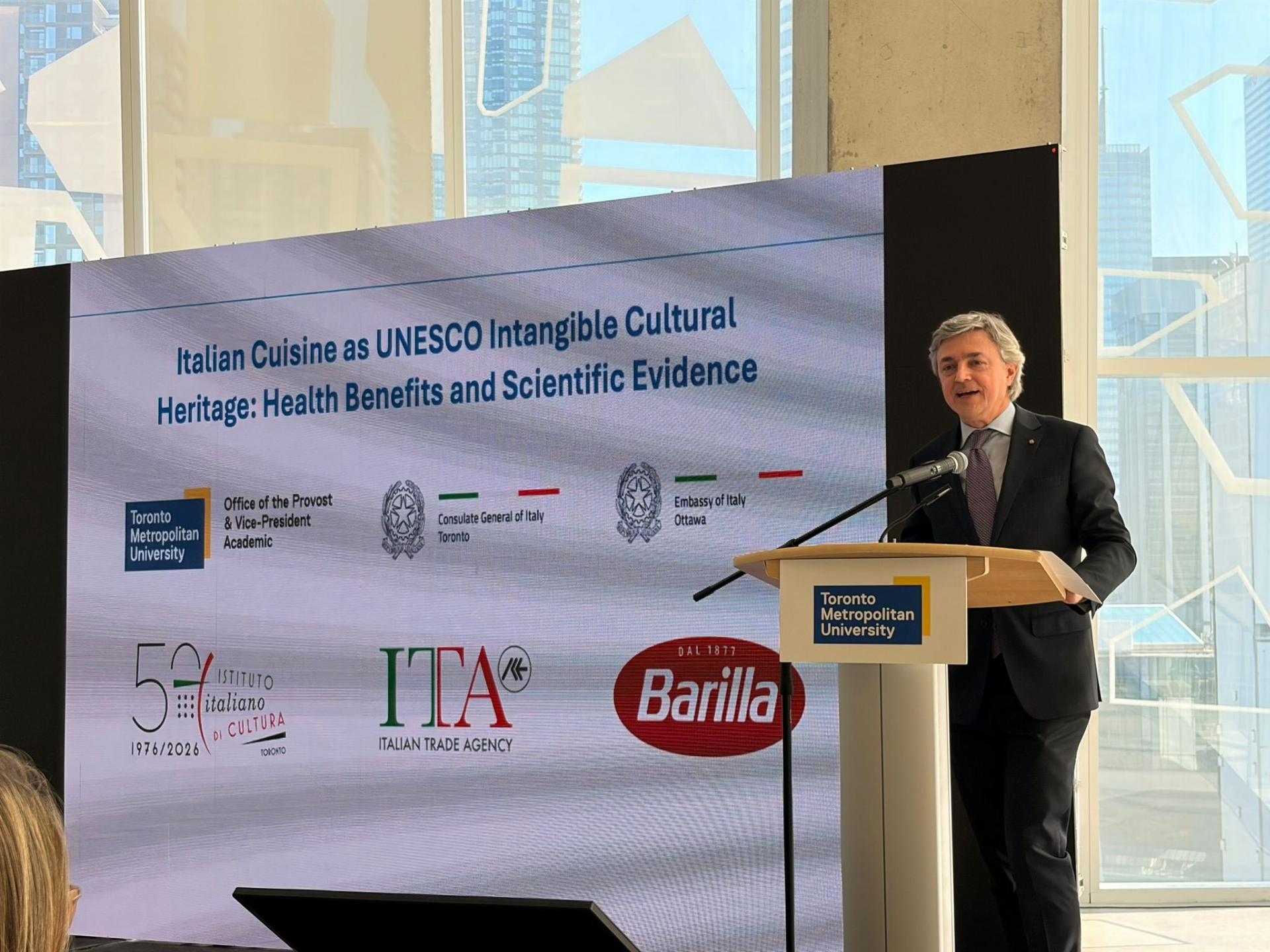 Al centro della visita il Simposio scientifico “Italian Cuisine as UNESCO Intangible Cultural Heritage: Health Benefits and Scientific Evidence”, organizzato dall’Ambasciata d’Italia a Ottawa con il sostegno del Consolato Generale d’Italia, dell’Ufficio ICE e dell’Istituto italiano di Cultura a Toronto e in collaborazione con Barilla. LaToronto Metropolitan University ha ospitato il simposio, aperto dalla Prof.ssa Roberta Iannacito-Provenzano, Provost e Vice President della TMU.